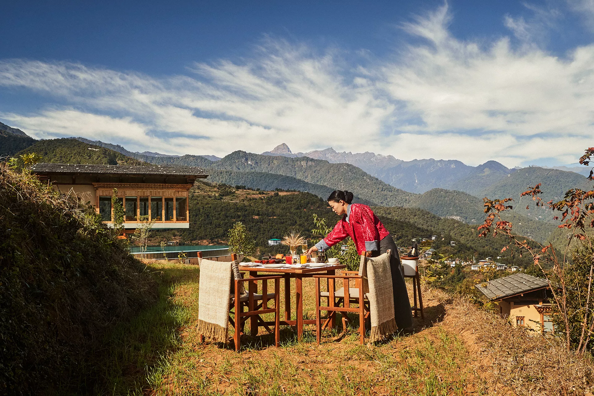 Piquenique à Beira-Rio: O lodge organiza almoços gourmet luxuosos nas margens do Rio Mo Chhu, ideais após uma sessão de rafting leve ou visita ao Punakha Dzong.