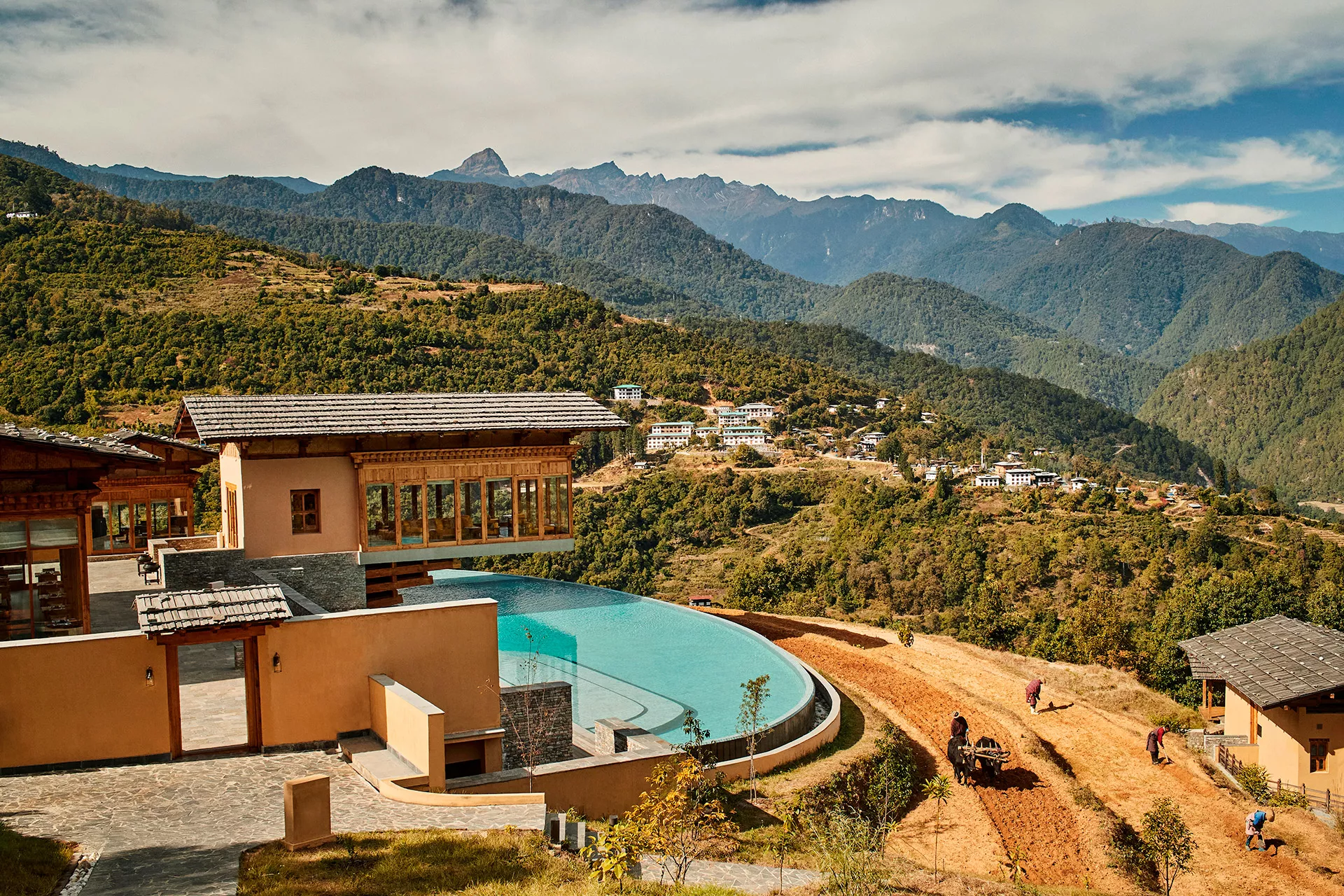 Piscina de Borda Infinita Aquecida: Relaxar nas águas aquecidas com vista panorâmica para os arrozais, uma exclusividade absoluta deste lodge no Butão.