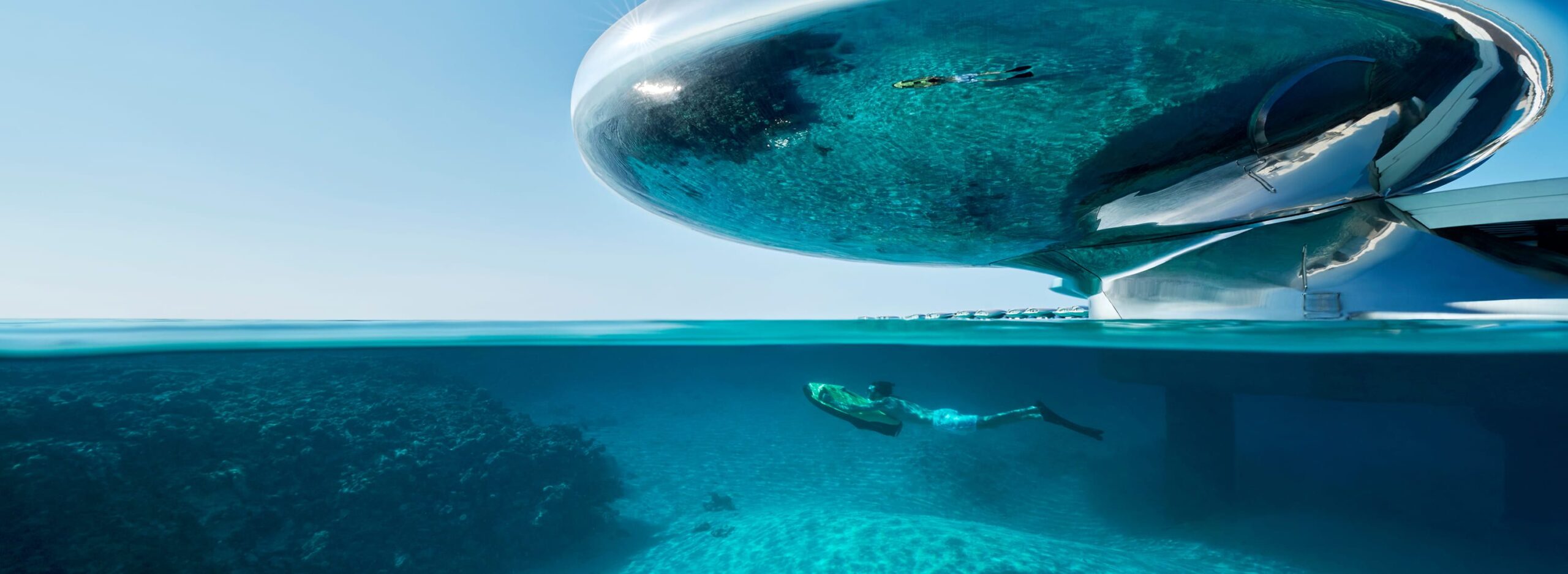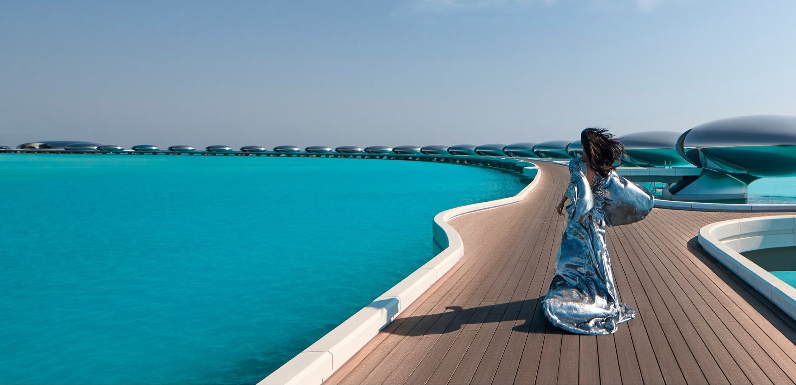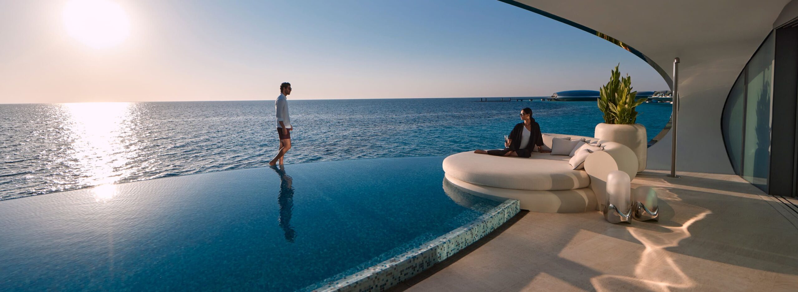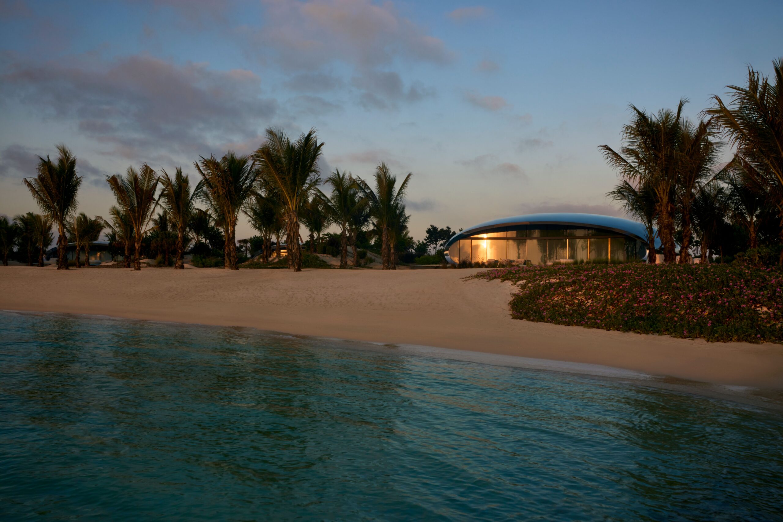 O design das vilas remete a cápsulas espaciais, e cada uma conta com piscina privativa, mordomo dedicado e acesso direto ao mar.
