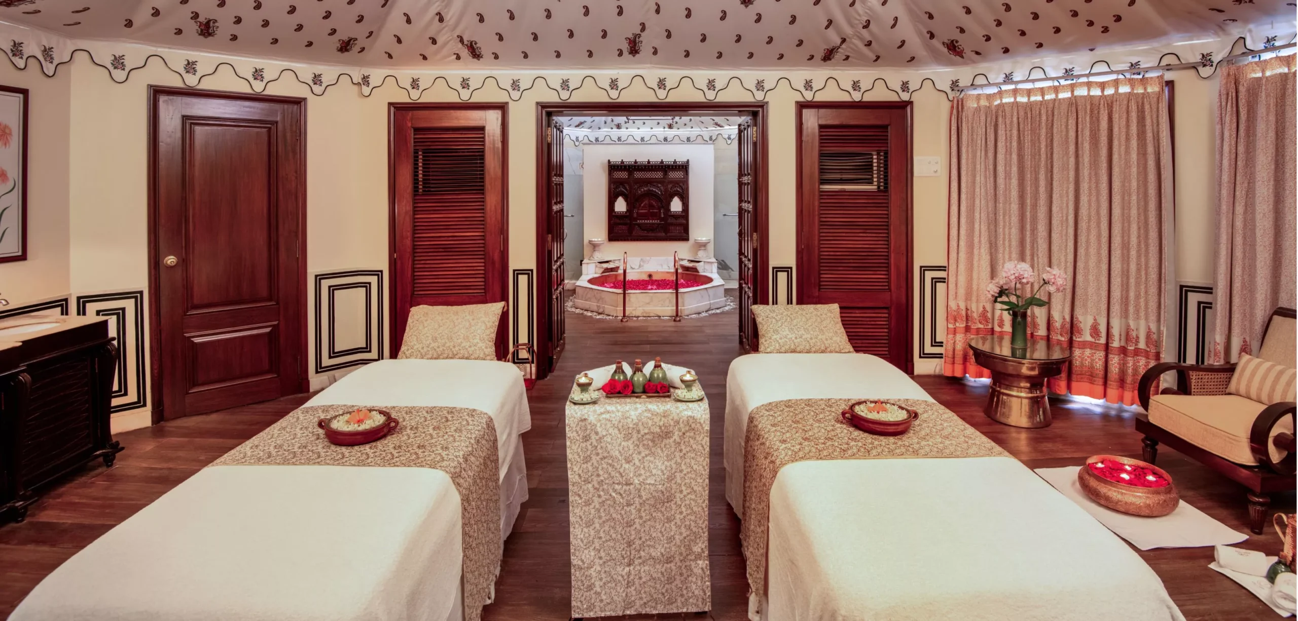 Jiva Grande Spa: Tratamentos realizados em tendas de luxo nos jardins ou em suítes reais, utilizando óleos indianos raros e técnicas de relaxamento milenares.