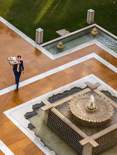 • Cerimônias ao Entardecer: O hotel realiza rituais diários com músicos folclóricos e dançarinos locais nos pátios, celebrando a cultura vibrante de Jaipur.