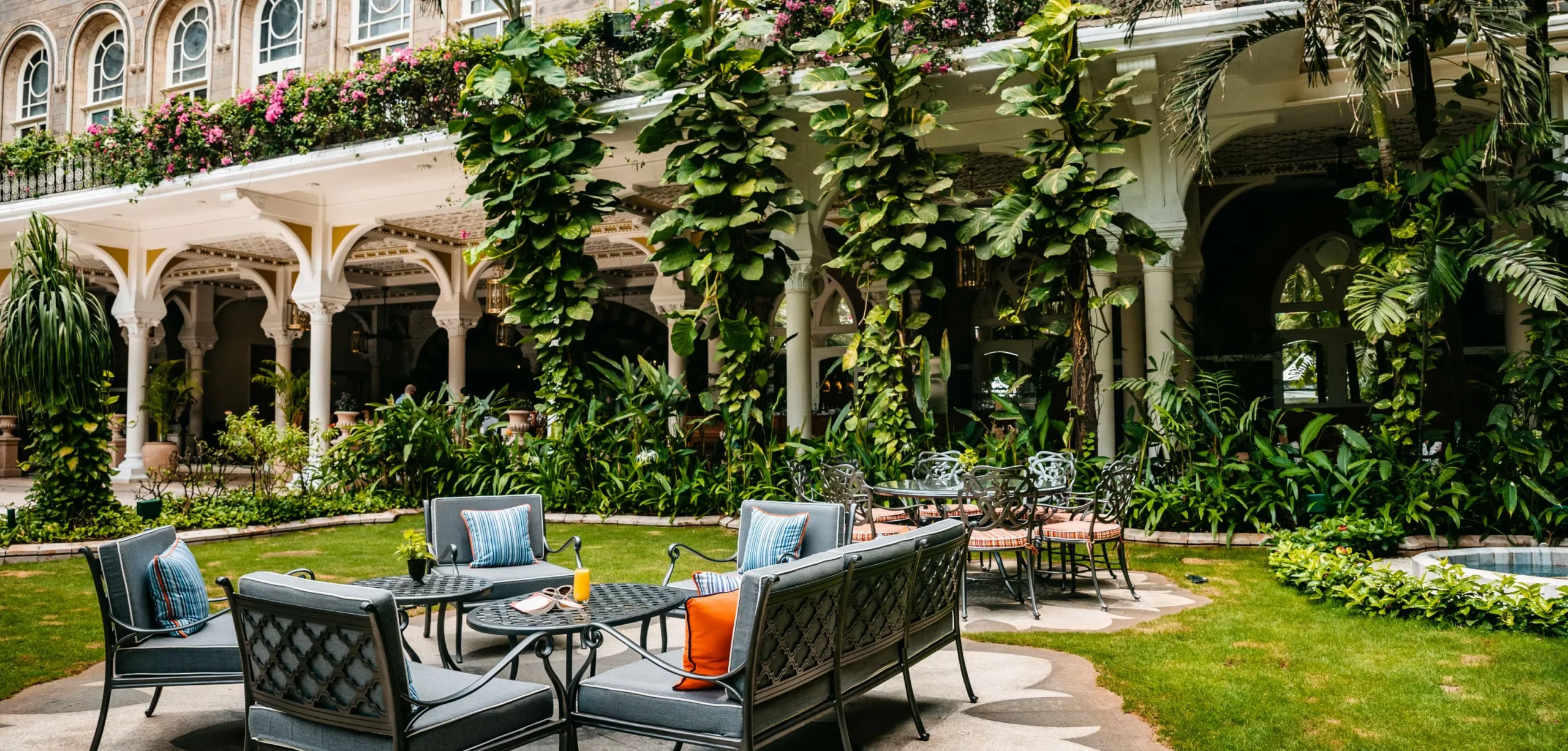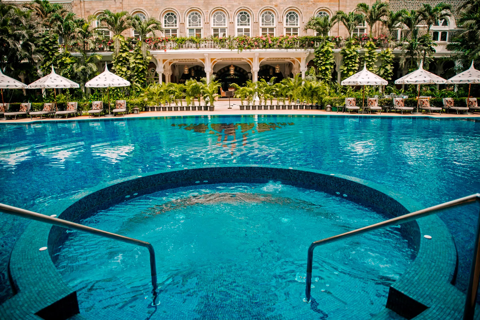 Piscina Central: Um oásis de tranquilidade cercado por colunas de pedra e jardins, oferecendo um refúgio do agito de Colaba.