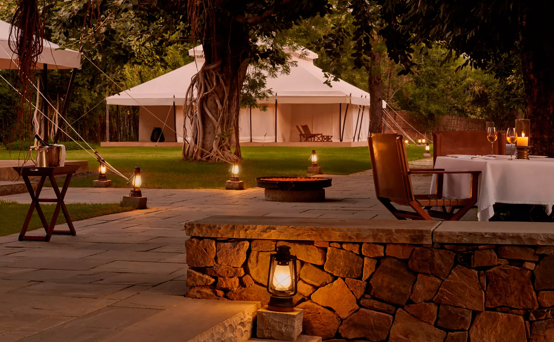 Inspiradas nas tendas de caça móveis dos imperadores Mughals, as acomodações do Aman-i-Khás são estruturas de lona branca com 6 metros de altura, dispostas em um cenário de savana e colinas de arenito. O design interior é minimalista e arejado, dividido por cortinas de algodão que separam as áreas de dormir, banho e vestir. No centro do acampamento, um pátio com uma fogueira comunitária serve como o ponto de encontro sob as estrelas, criando uma atmosfera de expedição aristocrática do século XIX combinada com o luxo contemporâneo da Aman.