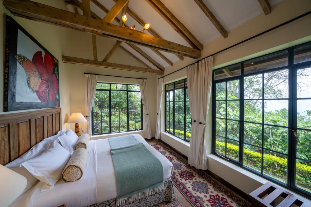 Suspenso sobre a borda da floresta de Bwindi, o Clouds Mountain Gorilla Lodge é o lodge mais alto de Uganda, com vistas arrebatadoras para os vulcões Virunga e o Vale do Rift. Construído com pedra vulcânica e madeira local, o lodge combina rusticidade elegante com serviço personalizado e acesso direto à trilha de gorilas da família Nkuringo. É uma propriedade boutique com apenas oito cottages, cada um com lareira, sala de estar e varanda privativa — ideal para quem busca exclusividade e conexão profunda com a natureza.