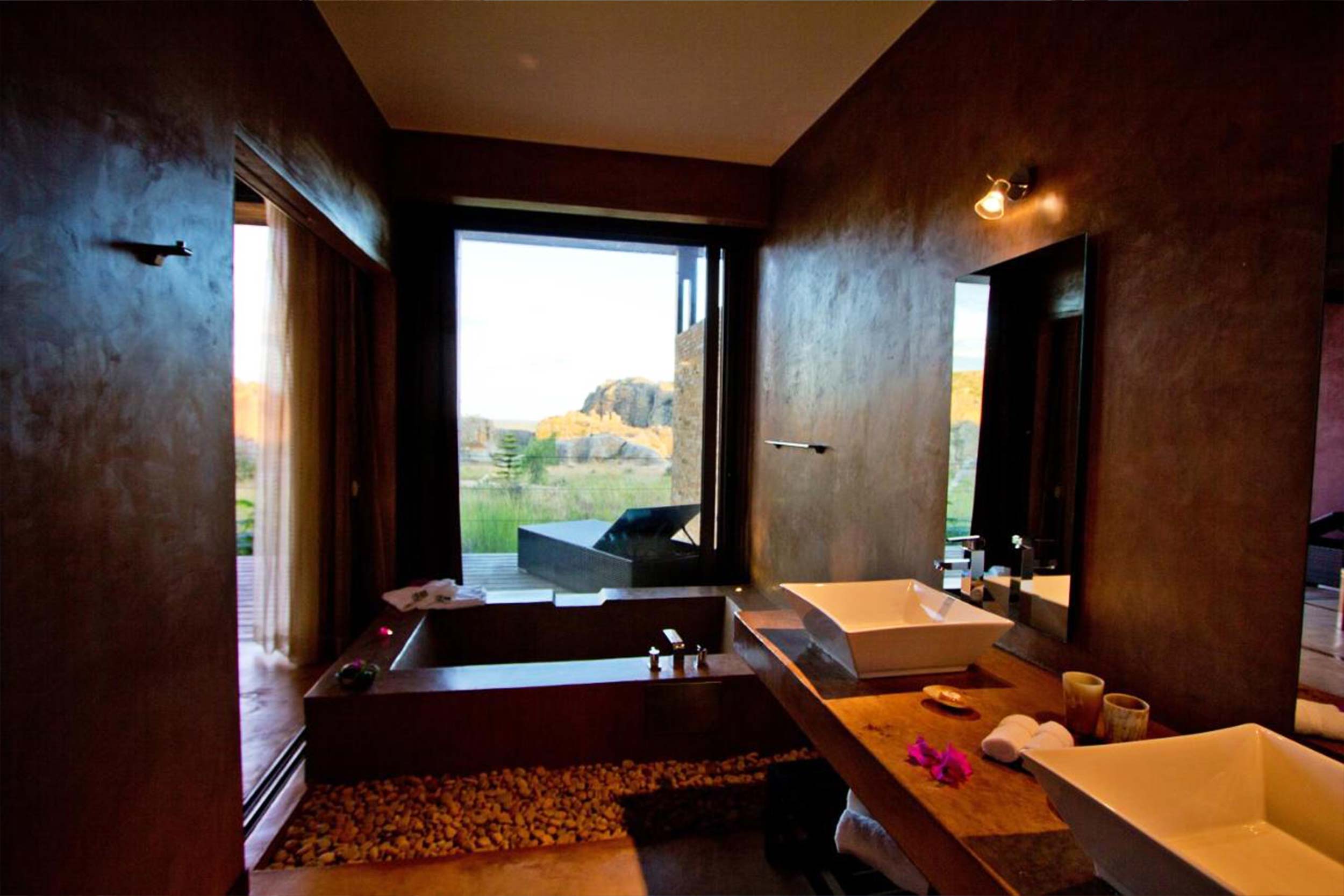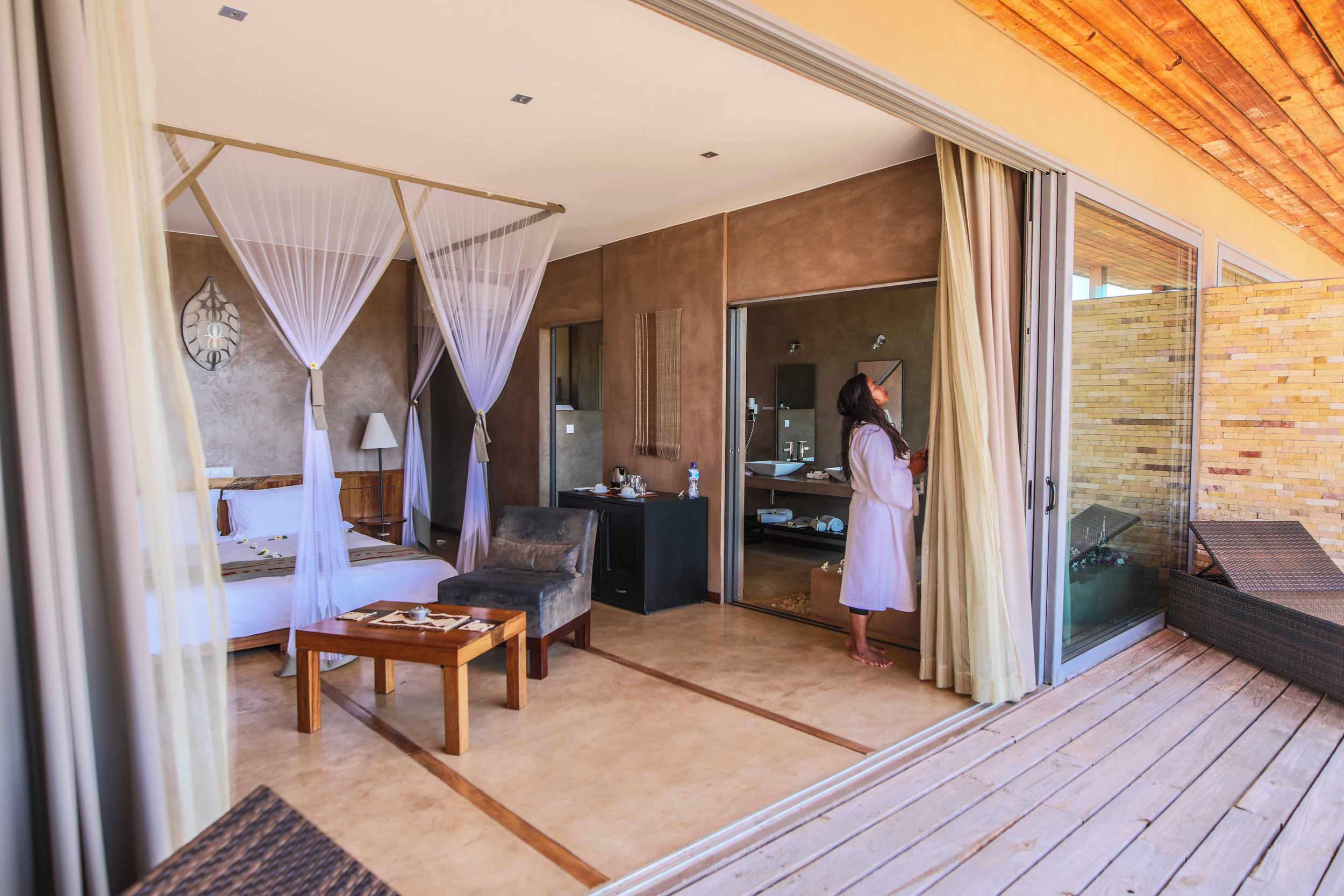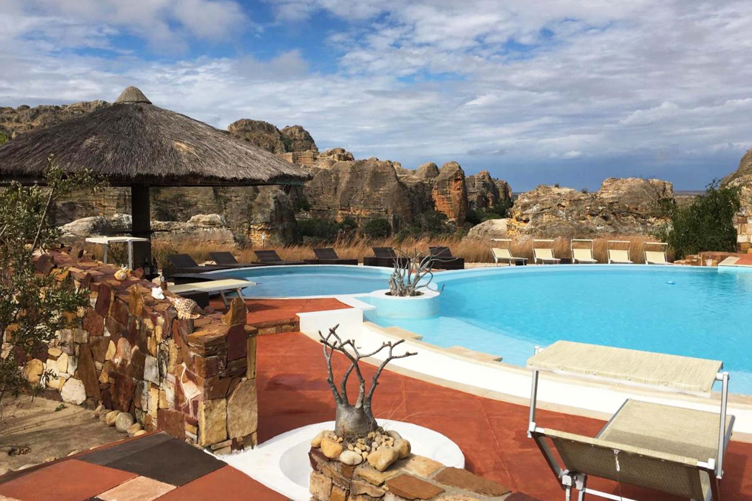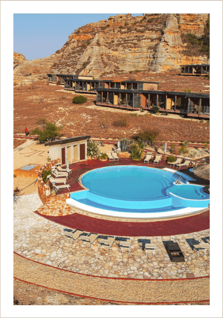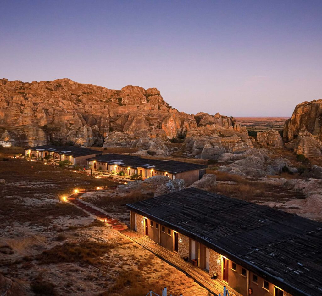 Situado nas formações rochosas dramáticas do Parque Nacional Isalo, o Isalo Rock Lodge combina design contemporâneo com paisagens surreais de cânions, savanas e piscinas naturais. O lodge oferece acomodações elegantes com vista para o deserto malgaxe, criando uma experiência de luxo em meio à natureza árida e mística do sul de Madagascar.